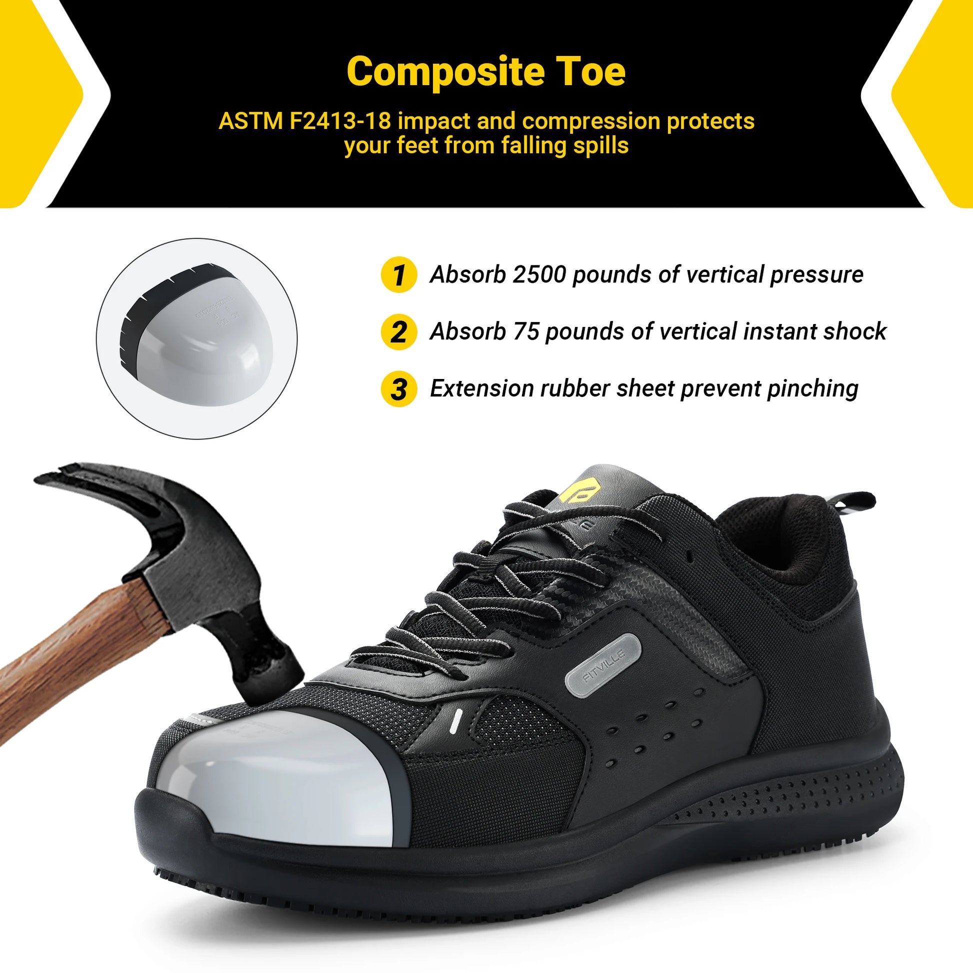 Rigorously tested for vertical impact up to 75 pounds and vertical compression up to 2500 pounds, the TitanToe offers you top-notch safety and shock absorption. This shoe meets ASTM F2413-18 standards.