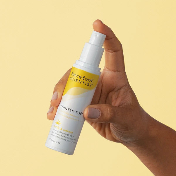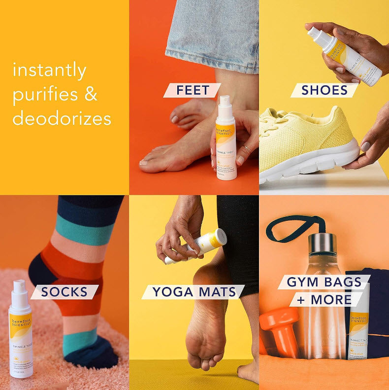 Twinkle Toes™ is the ultimate odor-eliminating, bacteria-killing, foot-freshening super spray. It combines 6 powerful anti-microbial agents to instantly wipe out the bacteria and fungus that cause funky odors.
