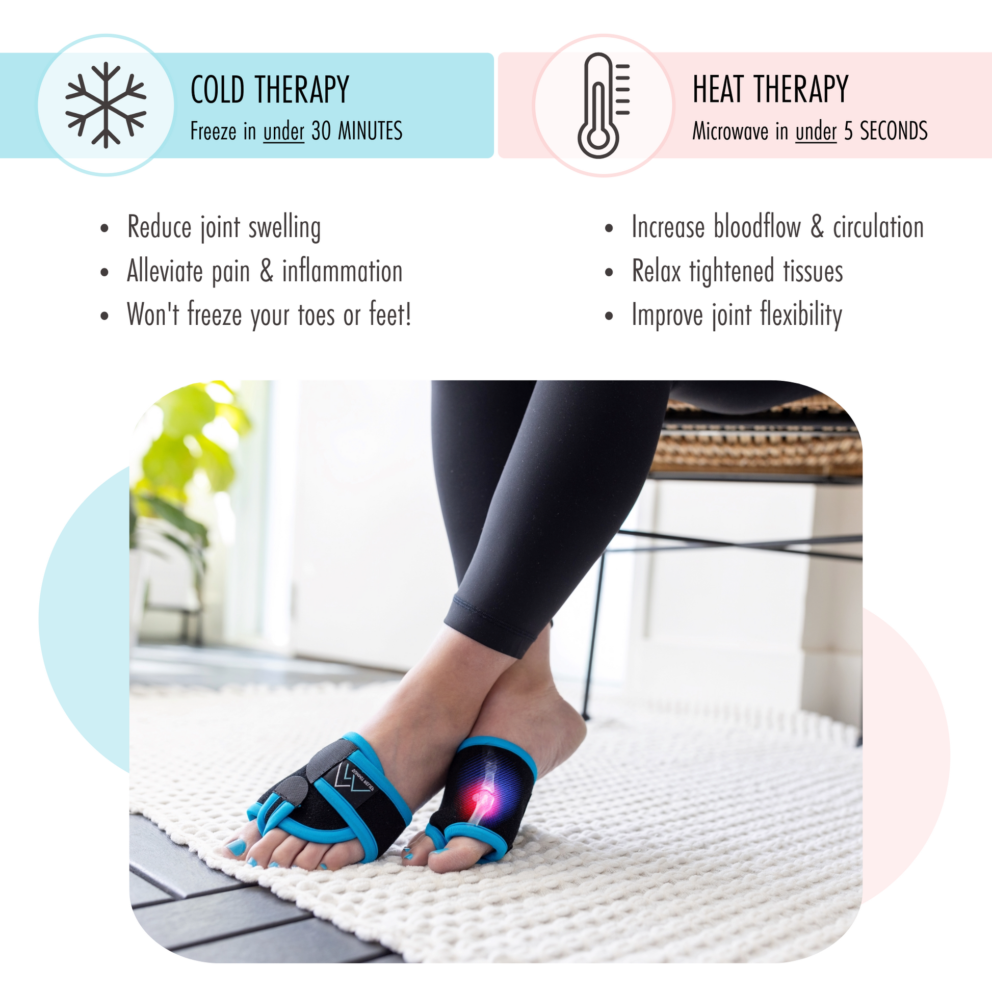 - CUSTOM DESIGN: Hand sewn to match the shape and curvature of your upper foot. We created this product for those with daily discomfort in their big toe and surrounding joints. It’s time to do the happy dance if you’re tired of using oversized ice packs, plug-in heating pads, cold socks or tight slip-on toe compresses to apply Hot & Cold Therapy to your MTP joint.